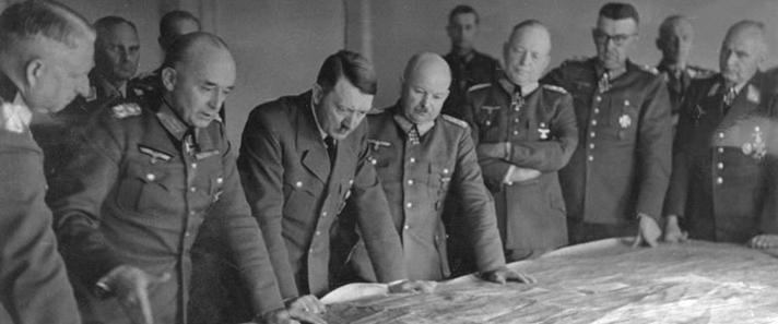 攝于1943年3月,曼斯坦因(左一),希特勒(左三)蔡茨勒(左四),克萊斯特(左五)在商討軍事行動(dòng)。